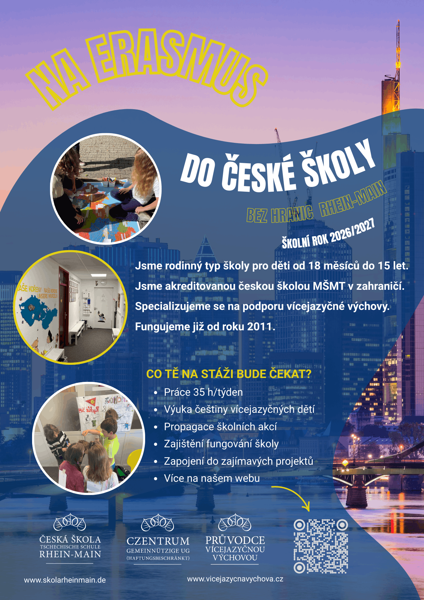 Do naší školy docházejí děti ve věku od 18 měsíců do 15 let. Specializujeme se na podporu rodin ve vícejazyčné výchově. Praxí u nás si vyzkoušíš práci s dětmi různých věkových kategorií, abys pochopil/-a rozdílnosti ve vývojových stupních. Jsme jednou z mála českých škol v zahraničí, která disponuje volnými prostory. Sídlo máme ve Frankfurtu, učíme v Zeppelinheimu (třetí výstupní stanice metrem za hlavním nádražím linkou S7).
