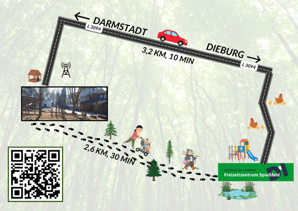 AUTEM ze směru Darmstadt jeďte po Dieburger Straße směrem na Dieburg (vedlejší silnice!), kolem Forthaus Hirschköpfe, Oberwaldhaus, Grube Prinz von Hessen, jeďte asi 8 km od hranic města Darmstadt až k odbočce na Messel, tam pokračujte rovně směrem na Dieburg, po cca 1 km na vrcholu kopce na jih je ukazatel (vpravo) odbočte – kolem televizní věže, po cca 500 m je Naturfreundehaus na pravé straně. Pozor: při odbočte ze silnice L 3094 je značka zákaz vjezdu.